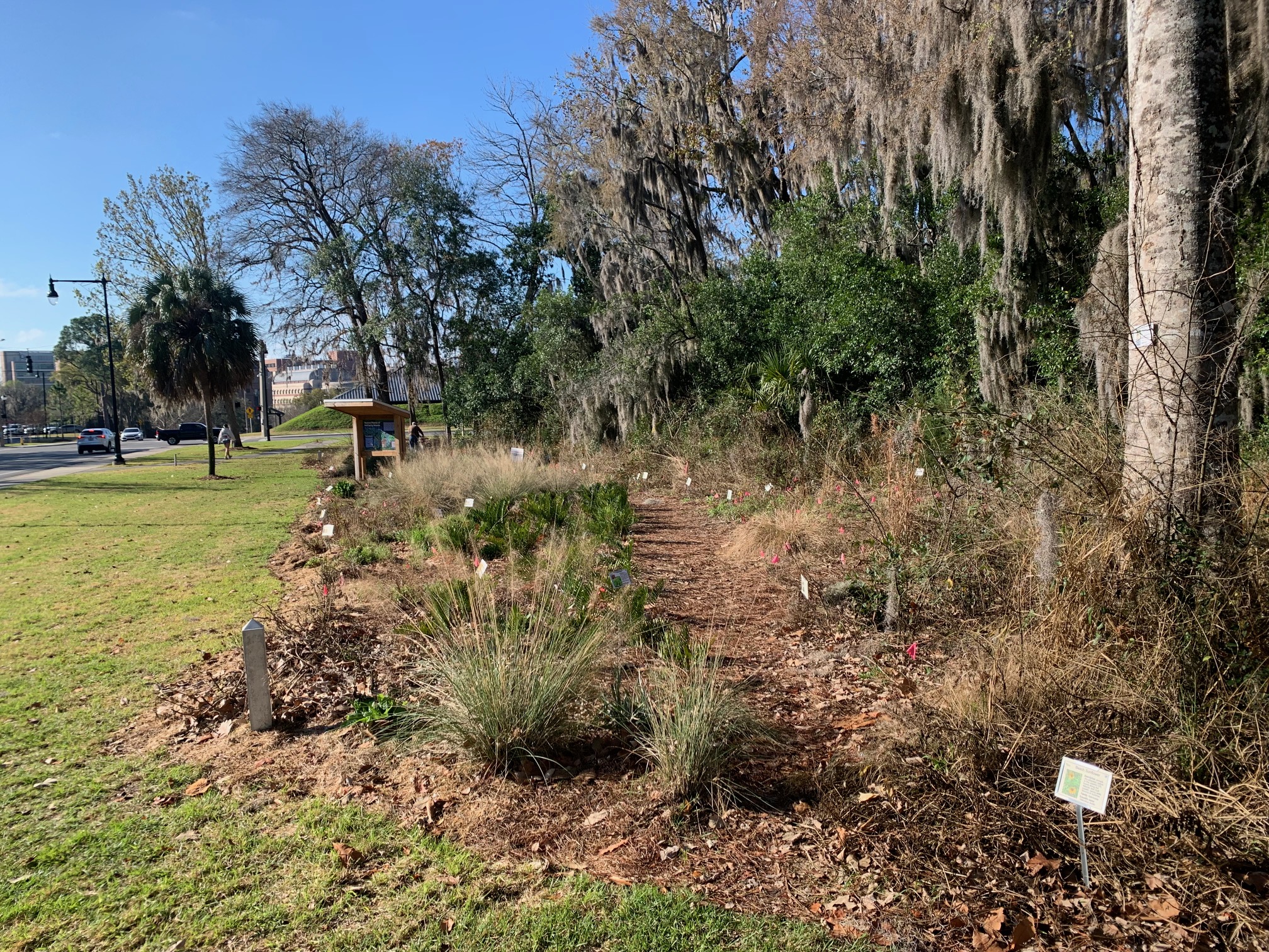 We cleaned the kiosks and put in new signs. We made great progress removing more invasive trees and took out lots of Cats Claw. With the materials provided by UF Grounds and Natural Resources, we were able to immediately treat the trees and vines that we cut so they will not grow back. We opened up an old trail — with more work in December it should be ready for use. We also tagged some native trees on the edge of the woods that we want to make sure are protected (soap berry, red bay, tilia).